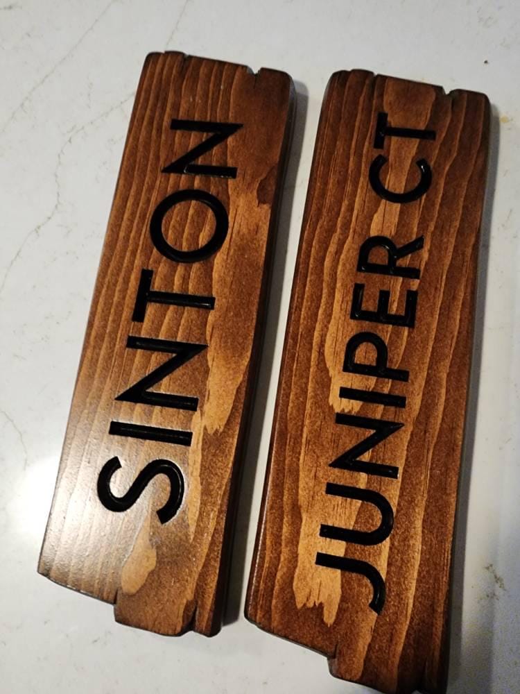 Make your sign your own by selecting your stain, from smoky greys to deep walnuts. Then, choose the colour of your engraving: natural or painted in black. Finally, choose your font. Feel free to choose up to three different fonts to see mock ups with each one. Please add your selections in the personalization window.